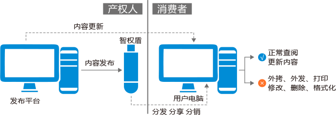 智权盾®防拷贝U盘旨在提供一种能够可靠离线受控传播的移动存储介质。文档或程序预先发布到智权盾®防拷贝U盘内,终端用户只能在智权盾®防拷贝U盘内部查阅文档或运行程序,而无法修改、外拷或者外发设备内部的资料。再辅以访问期限、次数限制等细粒度的管控功能,可以实现资料传播过程中处于全方位的受控保护下。